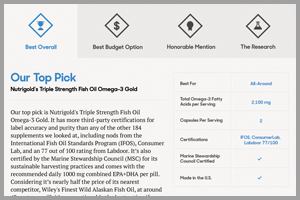 By creating a clear, numbered list, that includes a clear winner, this section is more noticeable. The bottom of this section also marks the fold of the site (on desktop and mobile). 70% of your users won’t see and don’t care about anything below this point. Giving all three items and their price at once gives the user the ability to make a directed consumer choice. Presenting the price upfront is important as it shows Reviews.com’s commitment to transparency. The “Winner Sticker” will give you a noticeable increase of conversions for product number one.